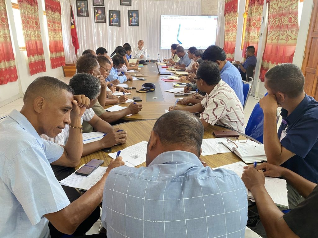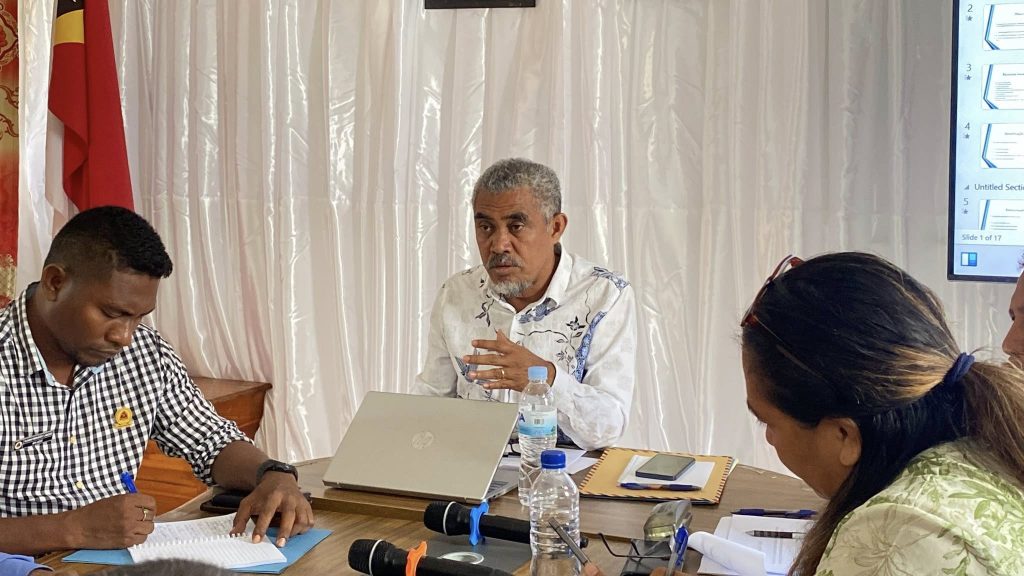 Prezidente da Autoridade Munisipal Manatuto Sr.Luis Inacio Henrique Fernandes Akompainha Husi Secam Asuntos Finansas Eduardo Guterres, Secam Asuntos PIDI Domingas Gilpia, Enkontru ho Diretores Servisu Munisipal no Delegasaun Teritoiral Hodi hare konaba Avaliasaun Kondisaun Minima atu hakat ba Poder Lokal.