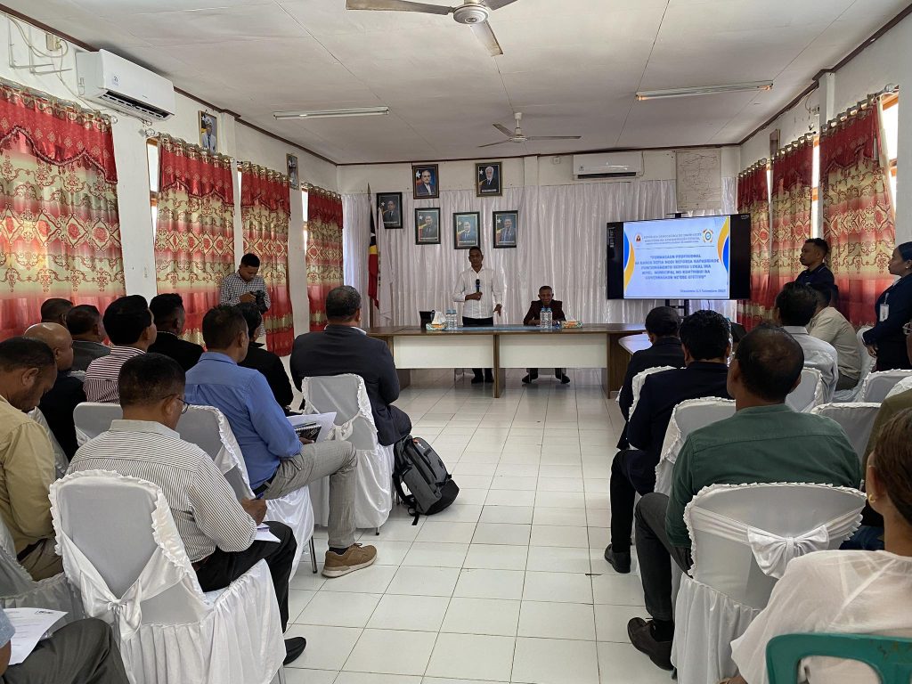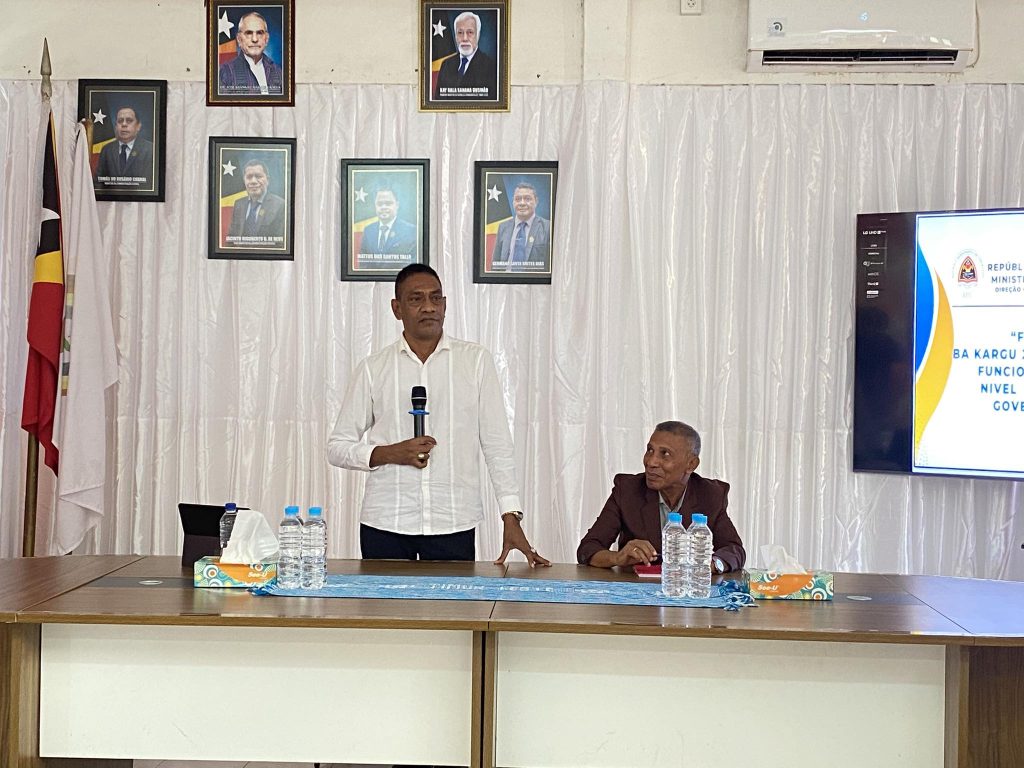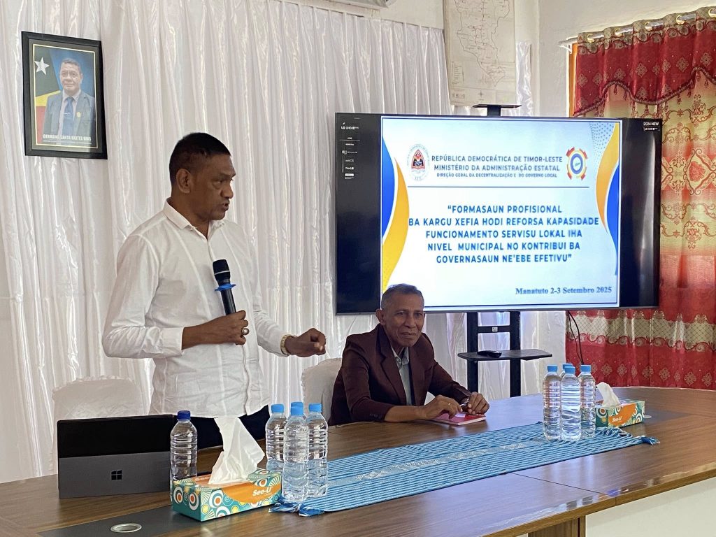 MANATUTO 02-Setembru-2025 Sekretaria Asuntos Administrasaun Finansas Sr. Eduardo Guterres Akompainha Diretรณr Jerรกl Desentralizasaun no Governu Lokรกl, Sr. Antonio Augusto Guterres, ofisialmente halo abertura ba atividade formasaun profissionรกl ba kargu Xefia no Tรฉkniku Administrativu sira iha Munisรญpiu Manatuto.